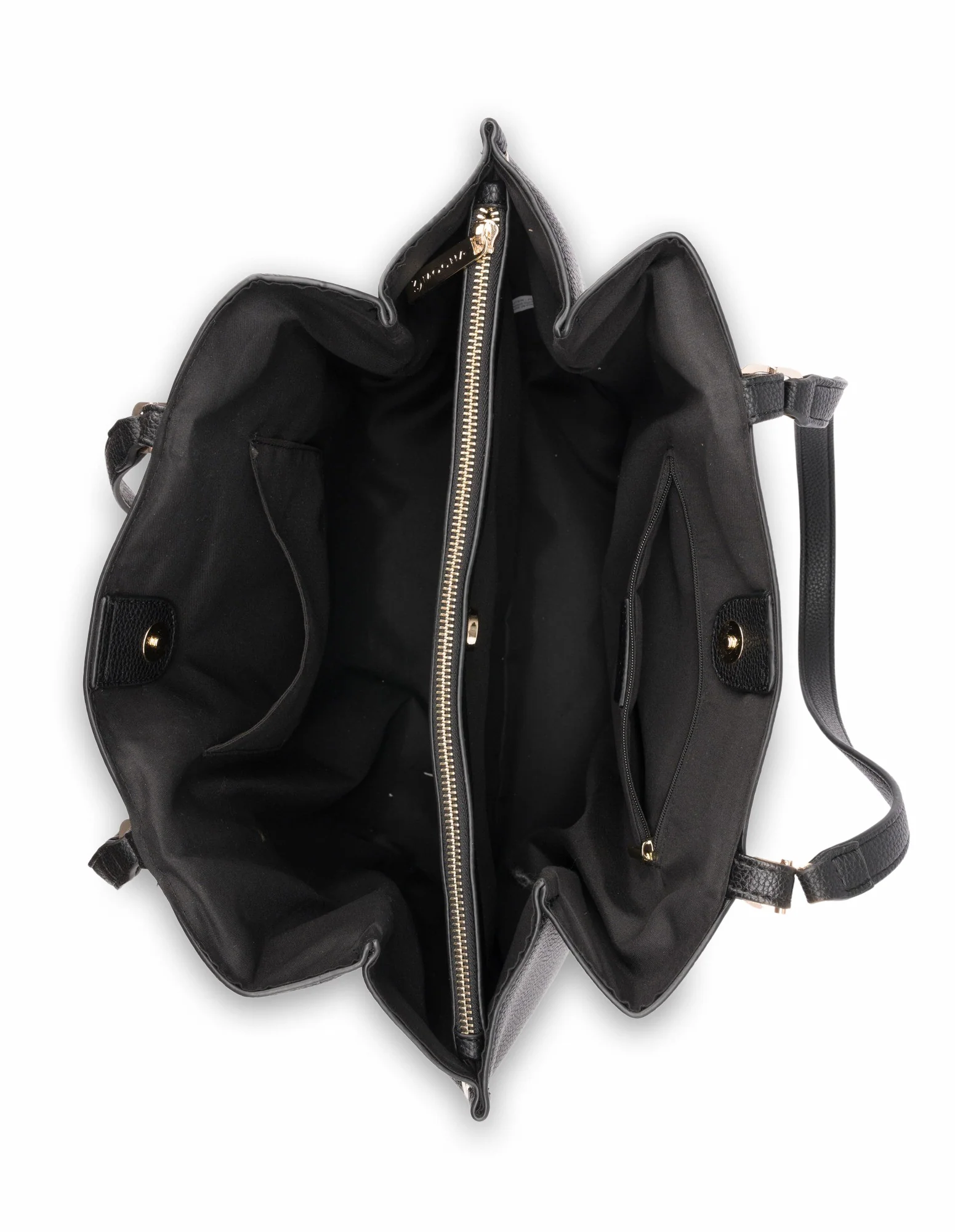 Introducing the Sienna Stud Tote Bag where sophistication meets flair. Featuring three spacious compartments inside to store all your belongings in an organized manner, and a beautiful gold chain on the exterior- when you carry this around you will turn heads thanks to this elegant tote. The Sienna Stud Tote comes in Black.